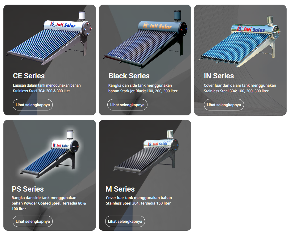 Inti Solar Palembang menghadirkan berbagai seri pemanas air tenaga surya berkualitas tinggi, dirancang untuk efisiensi, ketahanan, dan kenyamanan keluarga Anda