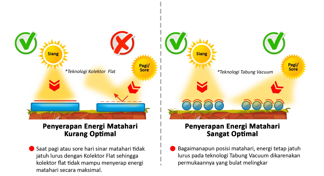 Dengan sistem ini penempatan kolektor dan tangki dapat fleksibel mengikuti bentuk dan desain arsitektural bangunan di berbagai kebutuhan dengan tetap menggunakan prinsip dan konsep Teknologi Tabung Vacuum Tube.