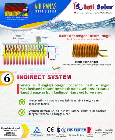 Indirect System ini dilengkapi dengan Cooper Coil heat Exchanger yang berfungsi sebagai pemindah panas, sehingga air panas dapat digunakan lebih berlimpah dan awet konversinya.